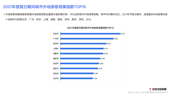 随着过去一年国内游的升温,一线及新一线城市也迎来了诸多外地游客。百度地图发布了外地游客规模指数,是根据外地游客总量绝对值折算所得,可以反映城市外地游客规模,城市间可横向比较。数据显示,2021年节假日期间,迎接最多外地游客的前十名城市分别是北京、广州、杭州、上海、成都、西安、苏州、南京、深圳、长沙。