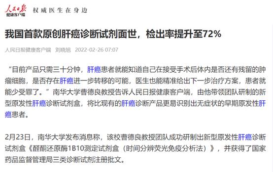 【人民日报】我国首款原创肝癌诊断试剂面世,检出率提升至72%