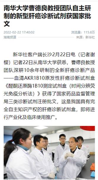 【红网】全球首个!南华大学曹德良教授团队自主研制出新型肝癌诊断试剂盒