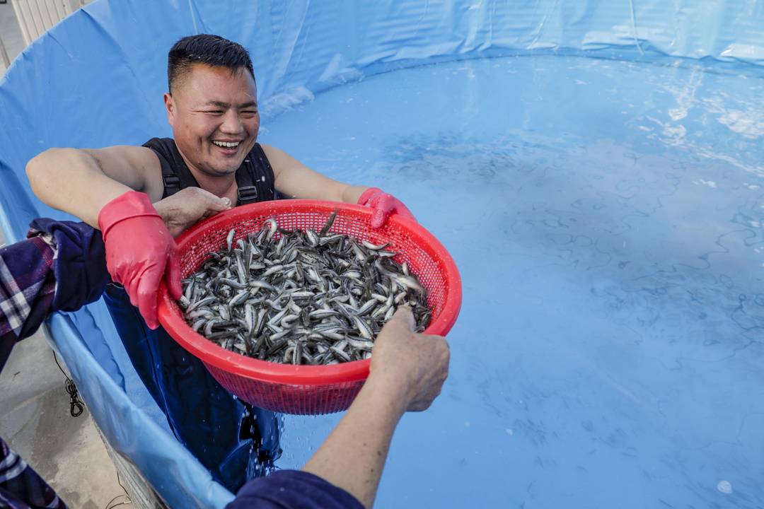 “加州鲈鱼‘六亲不认’喜欢‘大吃小’。”身穿皮裤的武世川站在鱼池里,不停地将经过初筛的鱼苗投入水中。