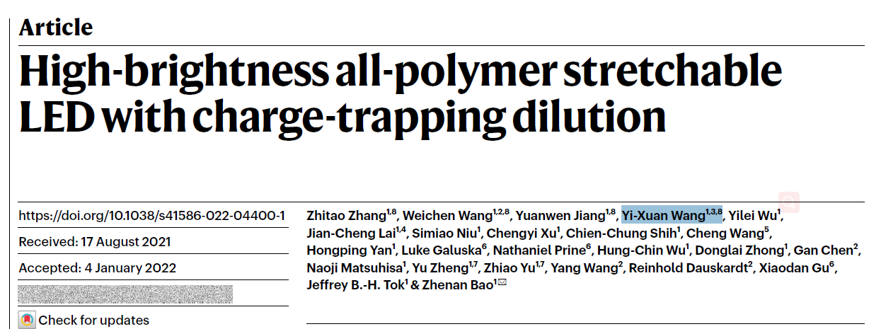 可拉伸发光二极管是人机交互系统中视觉信号反馈的理想器件,也是柔性显示领域的前沿技术。通过发光聚合物柔性化与陷阱“稀释”策略,结合电极材料基础与能带工程研究,研发了高亮度全聚合物可拉伸发光二极管。器件本征柔性-发光亮度综合效能世界领先。与柔性无线供能电路连接,实现了脉搏信号的随身实时显示。这一工作为未来显示技术在材料研发与器件制备工艺等环节开辟了新路线。相关成果以“High-brightness all-polymer stretchable LED with charge-trapping dilution”为题发表(Nature 2022, DOI: 10.1038/s41586-022-04400-1)。斯坦福大学张智涛博士、博士生王伟晨、蒋圆闻博士和天津大学王以轩副教授为共同第一作者,斯坦福大学鲍哲南教授为通讯作者。