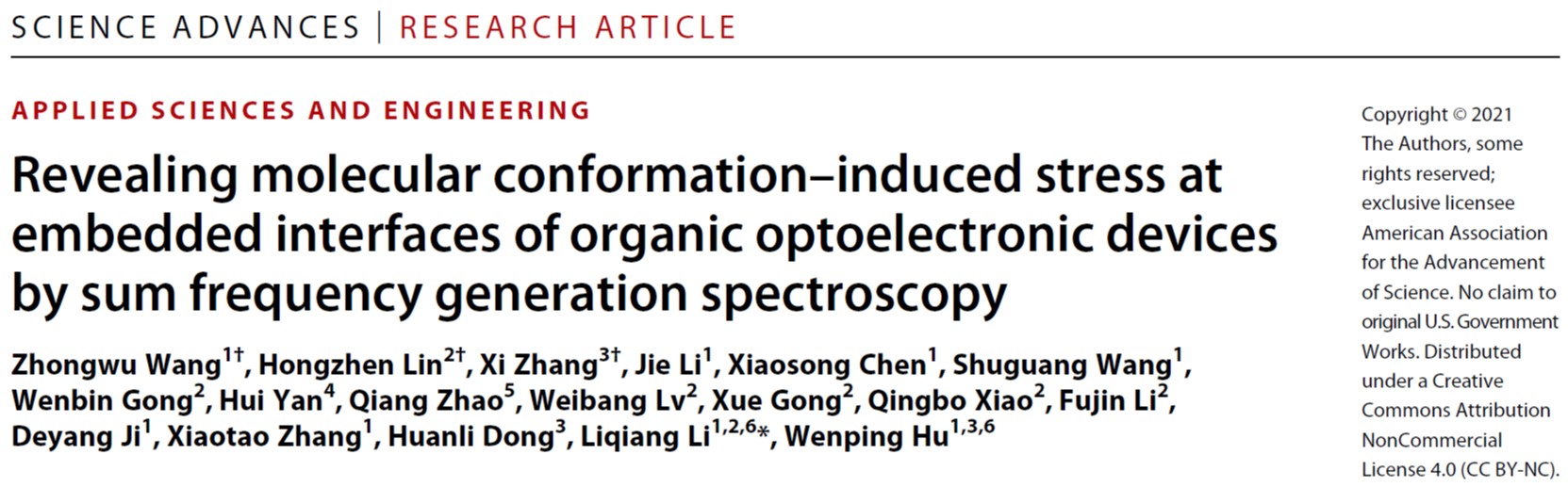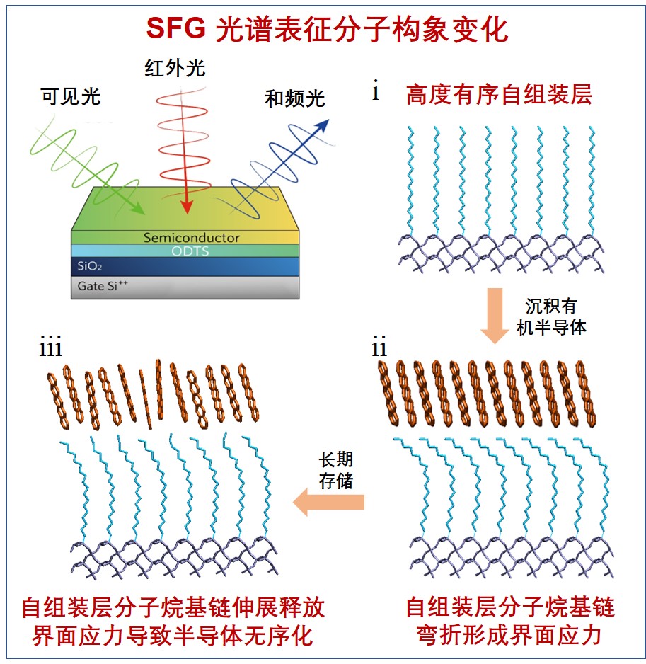 本项工作采用和频共振光谱技术揭示了在有机场效应半导体材料界面存在一种新型的分子构象诱导的界面应力,证明了该应力是材料老化(聚集态结构失稳演变)和器件性能衰减的主要内在原因,深化了对有机场效应半导体材料与器件稳定性的认知,为提升器件稳定性提供了理论支撑。