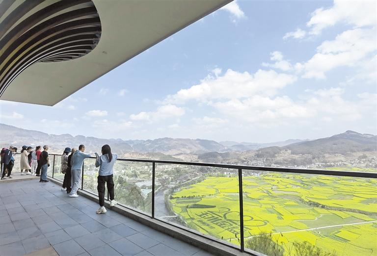 开阳县星悦田园民宿酒店观景台,游客在欣赏油菜花海。 方春英 摄