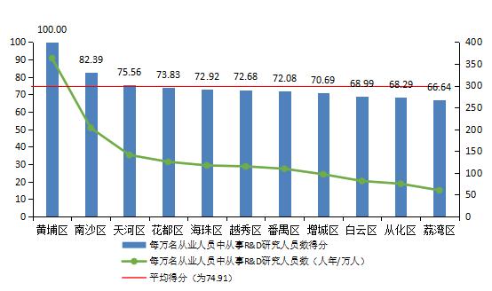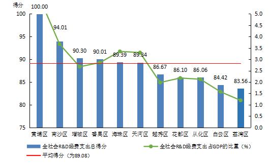 2020年广州各区全社会R&D经费支出综合指标,得分最高的是黄埔区,为100分;其次是南沙区,为94.01分;第三是增城区,为90.30分。