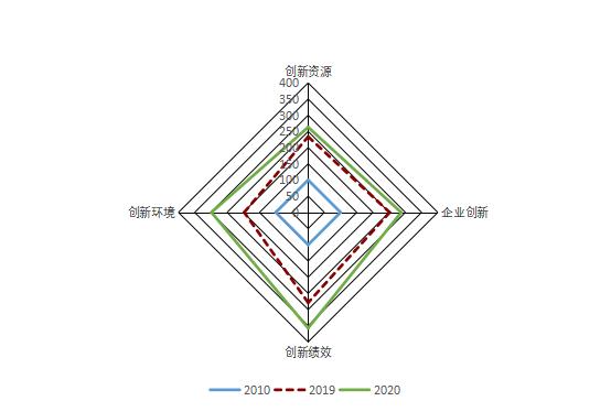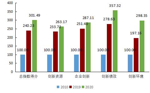 “创新绩效”2020年得分为357.32分,2010-2020年年均增长25.73分;