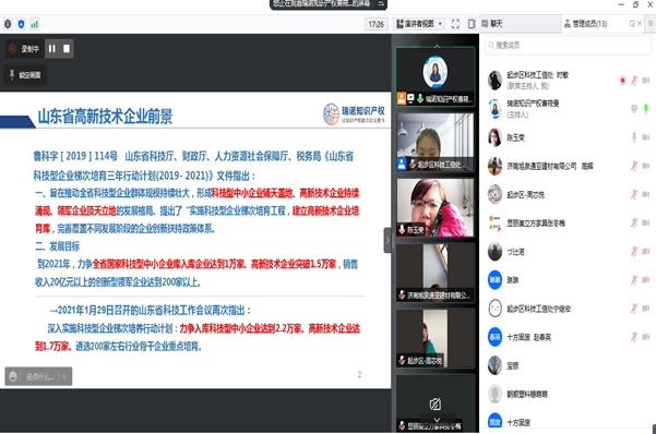 本次培训采取线上方式进行,为提高学习效果,根据报名企业情况,培训分三场进行小班宣讲,近30家企业参加了培训。专家围绕高新技术企业认定政策、评审条件、认定流程、注意事项、推动计划等方面进行了详细讲解。通过培训,进一步加强了企业对高企相关政策及申报要求的理解,为高质量做好高企认定申报工作提供了有力保障。