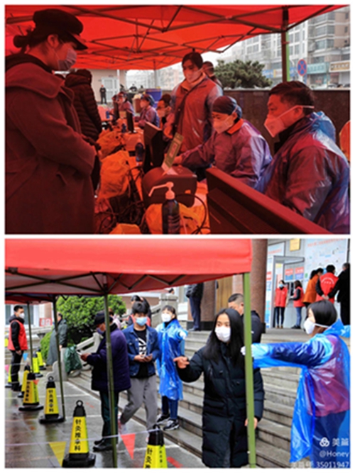 大规模检测第三天,阴雨绵绵,二妇幼出动几十名志愿者,红马甲、蓝雨衣,早上6点即到位,穿梭在雨中,搭帐篷、布场地。雨水打湿了她们的头发、雨水溅湿了她们的鞋袜。