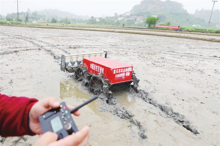 眼下正是春耕春种好时节。3月25日,在永川区来苏镇观音井村伍家坝村民小组的高品质绿色优质杂交水稻机械化直播示范现场,重庆市农业科学院农机研究所的技术人员正在操控水稻遥控直播机进行耕种作业。