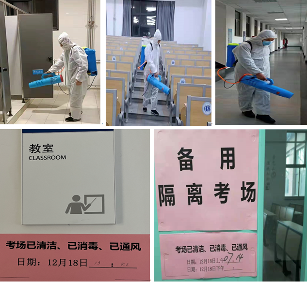 清洁消毒、提前准备。按照防疫防控要求,考试前安排保洁人员对各教学楼全面开展消毒消杀工作,清除卫生死角,增派保洁人员对每间考场教室进行清洁、消毒、通风,并张贴清洁、消毒、通风记录表,全力为考生营造安全、良好的考试环境。