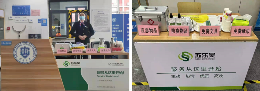 真情服务,暖心师生。在做好基础工作的同时,物业也在各考场教学楼大厅设置了真情服务台,免费为考生准备2B铅笔、电池、纸巾、纸杯、热水、咖啡、口罩等应急物品,方便考生使用。