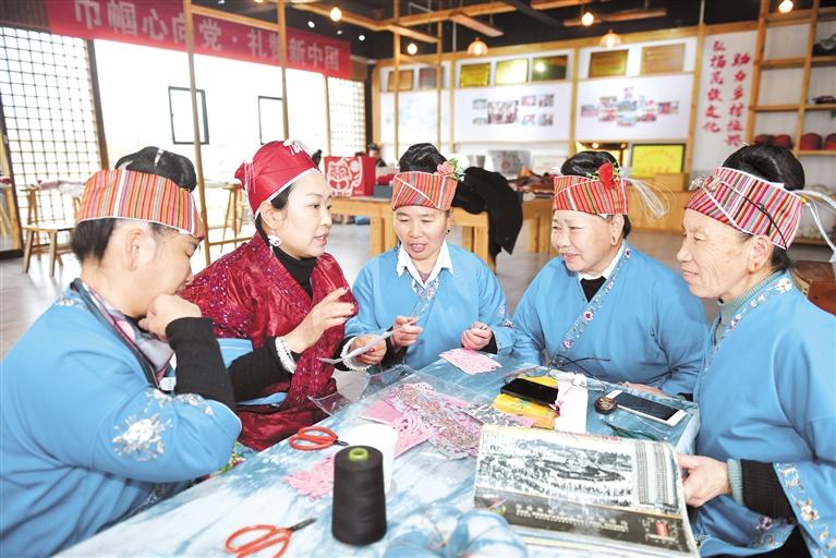黔东南州施秉县近年来依托东西部协作帮扶平台,在移民安置点及周边小区设立就业帮扶车间,开展刺绣技能培训,根据市场需要加工刺绣,让绣娘实现家门口就业增收、照顾家庭两不误,用巧手“绣”出幸福生活。图为当地省级非物质文化遗产苗绣传承人龙禄颖(左二)和绣娘们进行交流。