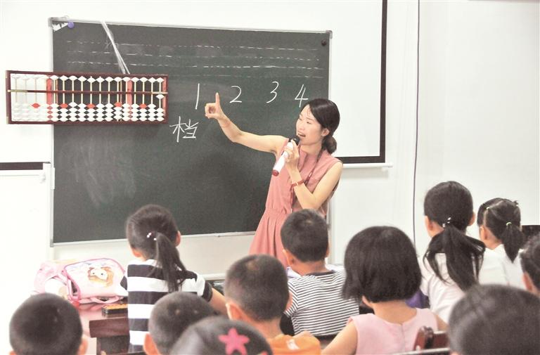 为解决易地扶贫搬迁群众的后顾之忧,习水县组织了志愿者36人,为易地扶贫搬迁点的学生进行课程辅导。图为授课老师在讲授珠心算。 黄国辉 摄 (贵州图片库发)