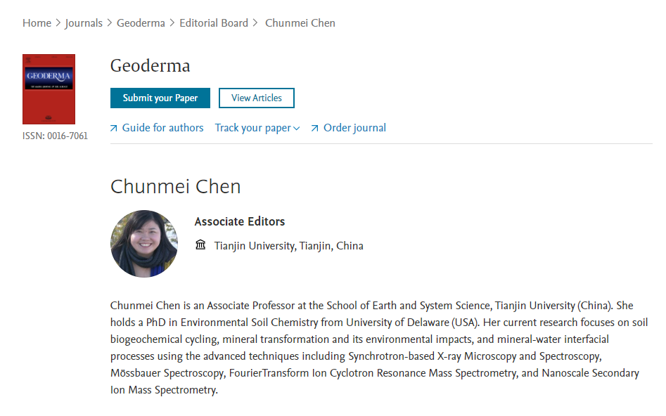 天津大学地科院陈春梅副教授应邀担任期刊《Geoderma》和《Soil Scie