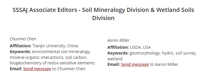 本站讯(通讯员 徐延平)应土壤科学领域知名期刊Geoderma和美国土壤学会会刊Soil Science Society of America Journal(SSSAJ)邀请,天津大学地科院陈春梅副教授自2022年1月起开始正式担任Geoderma副主编(Associate Editor)和SSSAJ副主编(土壤矿物学和湿地土壤方向,Soil Mineralogy Division & Wetland Soils Division)。