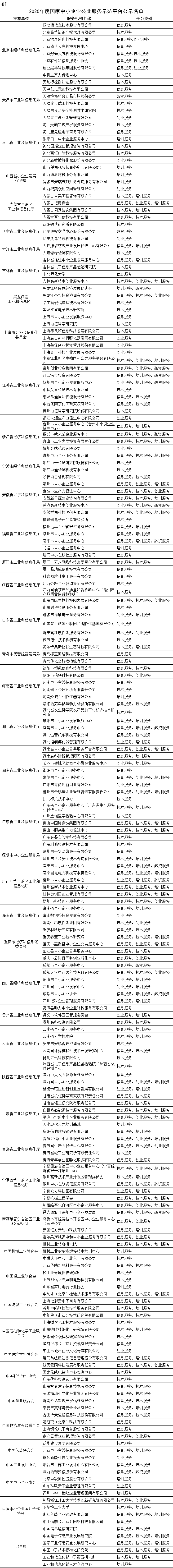 工信部关于2020年度国家中小企业公共服务示范平台名单的公示