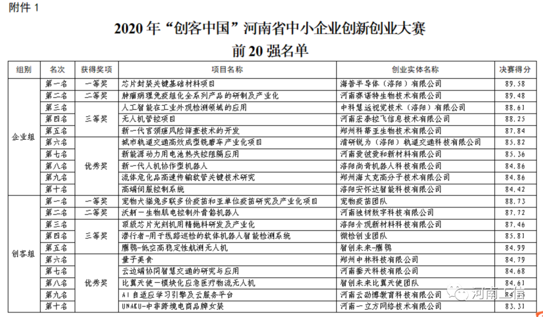 1.2020年“创客中国”河南省中小企业创新创业大赛前20强名单