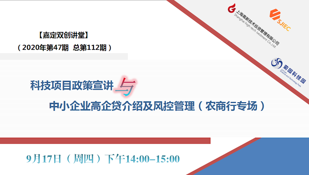 为帮助企业更好地把握高新技术企业申请认定和科技型中小企业技术创新资金的相关政策,了解并满足中小企业适用的高企贷金融产品,做到提前规划、适时申报,利用金融工具撬动企业发展的战略布局,嘉定区科技创新服务中心和上海高新技术投资管理有限公司通过嘉定双创讲堂,共同组织开展“科技项目政策宣讲与科技金融服务进园区”系列活动,助力地区科技企业获取更多的发展资源。具体活动内容如下: