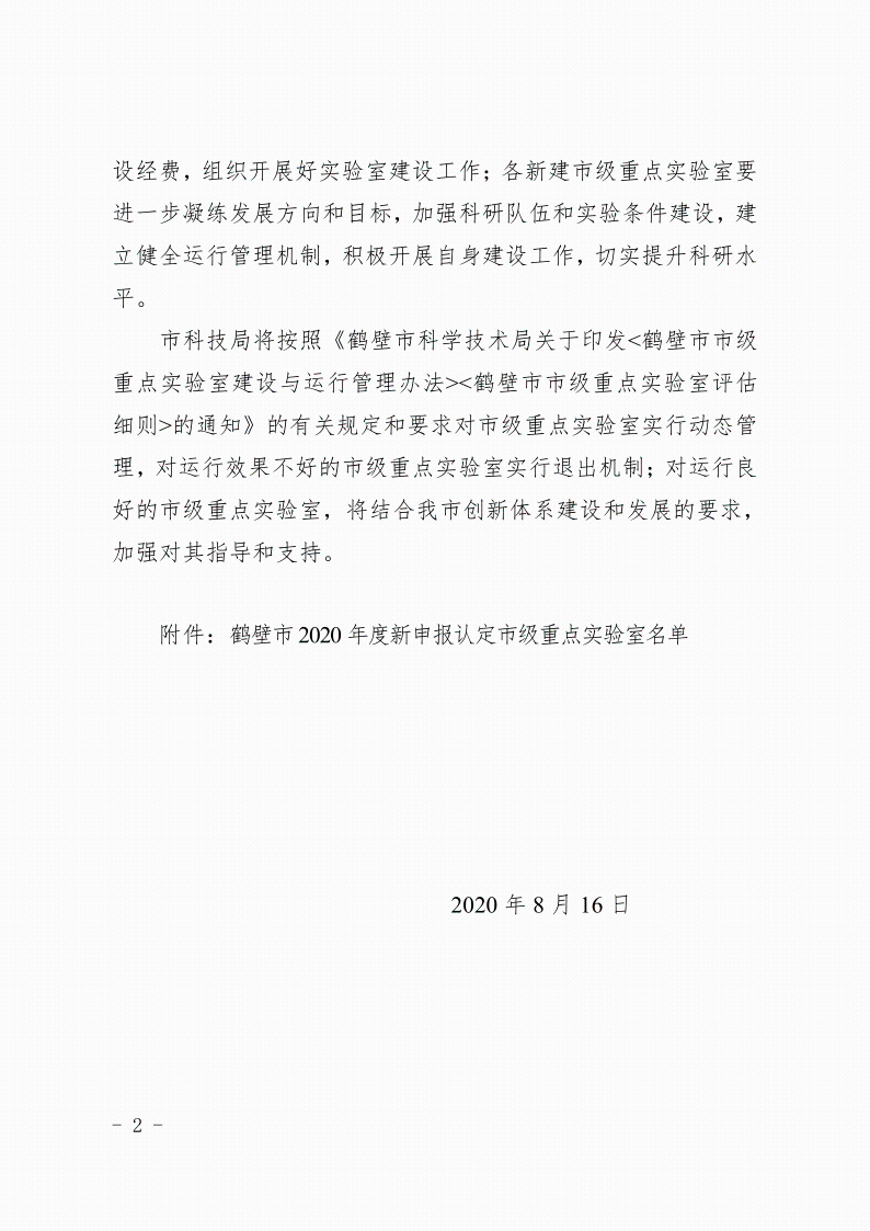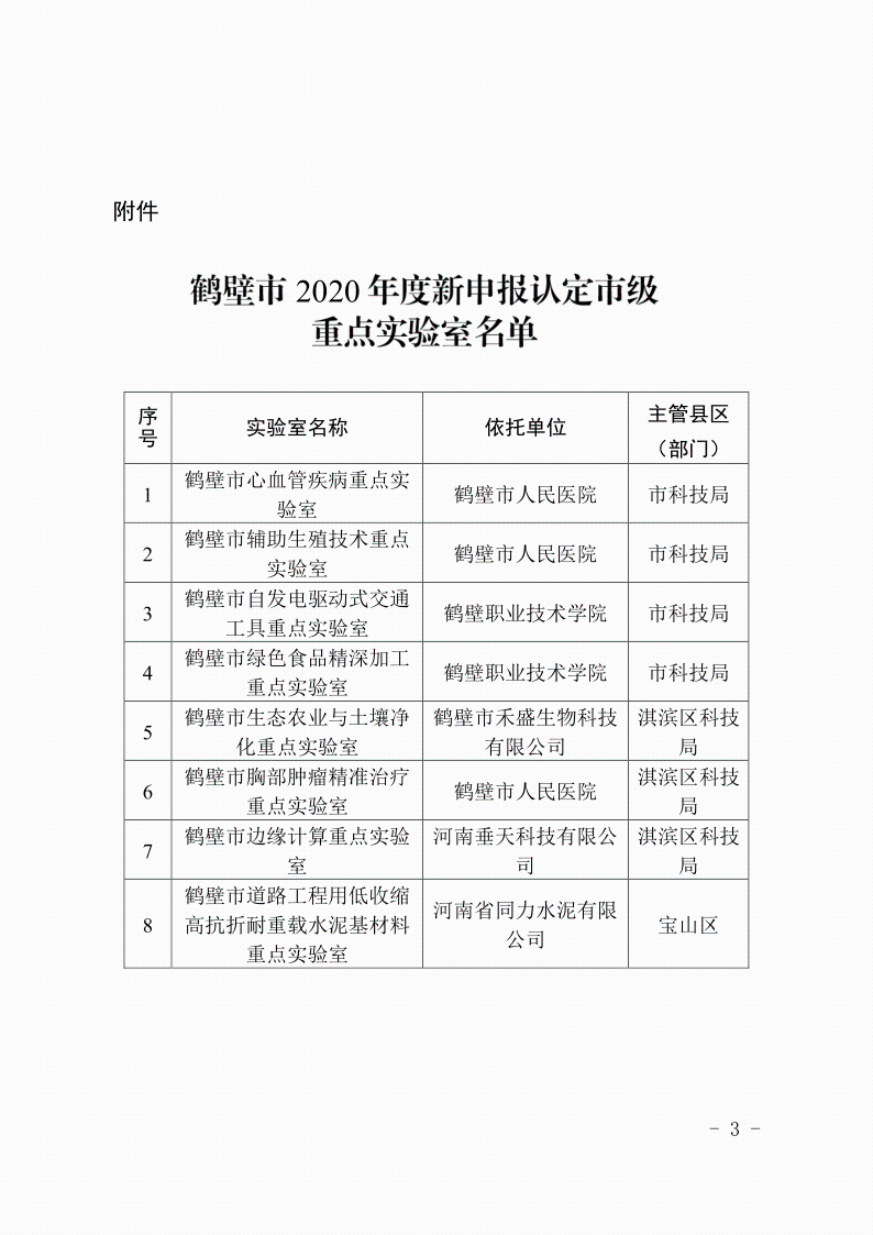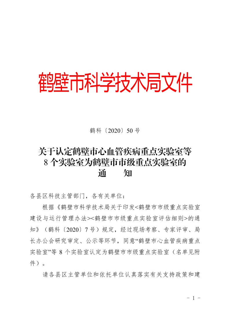 关于认定鹤壁市心血管疾病重点实验室等8个实验室为鹤壁市市级重点实验室的通知