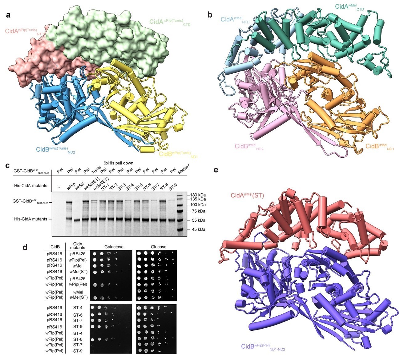 (a) CidAwPip(Tunis)-CidBwPip(Tunis)ND1-ND2复合物三维空间结构;(b) CidAwMel-CidBwMelND1-ND2复合物Alphafold预测模型;(c)人工嵌合蛋白CidAwMel(ST)能与来自不同菌株的CidBwPip产生相互作用,界面氨基酸进行回复突变则使得突变蛋白不能与CidBwPip互作,其中区域4、7和9在结合中起重要作用;(d)人工嵌合蛋白CidAwMel(ST)能够拯救CidBwPip诱导的酵母生长缺陷;(e) CidAwMel(ST) -CidBwPip(Pel)ND1-ND2复合物三维空间结构。