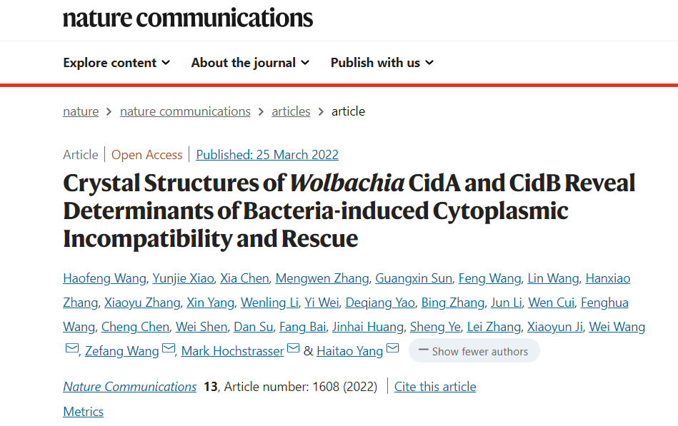 本站讯 2022年3月25日,天津大学生命科学学院王泽方教授团队在《自然-通讯》(Nature Communications)上发表题为“Crystal Structures ofWolbachiaCidA and CidB Reveal Determinants of Bacteria-induced Cytoplasmic Incompatibility and Rescue”的研究论文,报道了通过设计沃尔巴克氏菌胞质不相容性因子,实现了人工操纵胞质不相容。这种本由细菌引发的胞质不相容性现象被用于控制蚊虫种群的数量,从而达到防治虫媒疾病的目的。此项研究成果是王泽方教授团队近期继揭示胞质不相容性的分子机制之后(详见PNAS|破解利用细菌导致蚊子“不孕不育”的分子机制),在抗蚊媒疾病研究领域取得的又一重要进展。