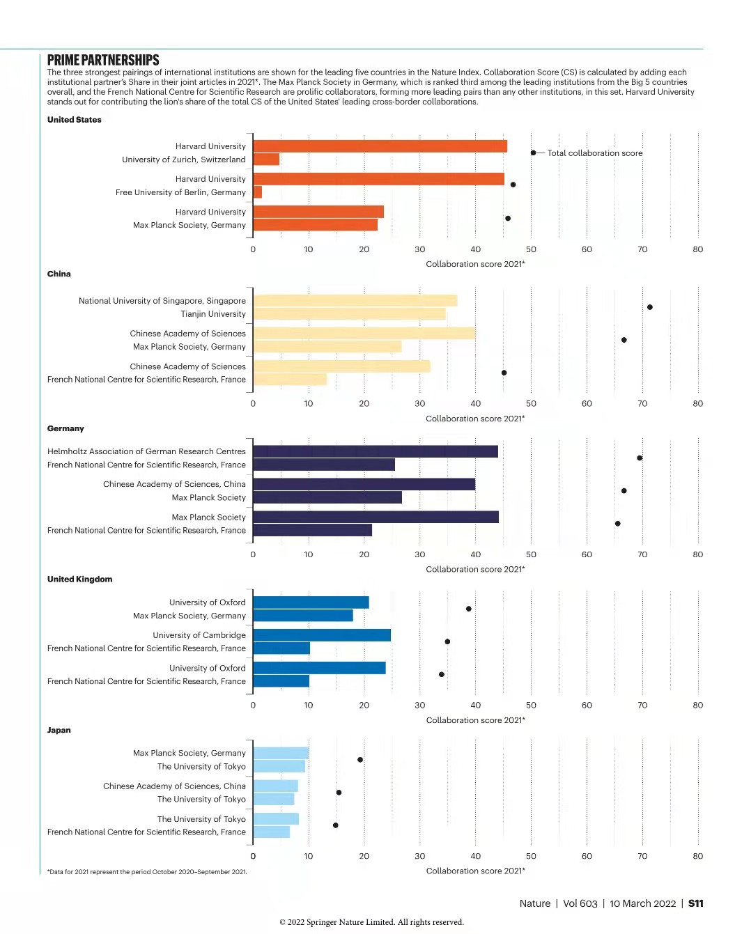 本站讯(通讯员 吴莉)近日,最新发布的《Nature Index 2022 Big 5》增刊基于Nature Index数据库,涵盖了2015年至2021年间发表的研究论文。这份增刊展示了前五强国家(美国、中国、德国、英国和日本)的研究成果,以及十余个最强合作伙伴关系并计算出2021年度合作得分,其中包括美国哈佛大学与瑞士苏黎世大学、中国科学院与德国马克思·普朗克学会科学研究所等顶尖机构的合作项目。天津大学与新加坡国立大学合作项目,从众多最强合作关系中脱颖而出,获得最高分。