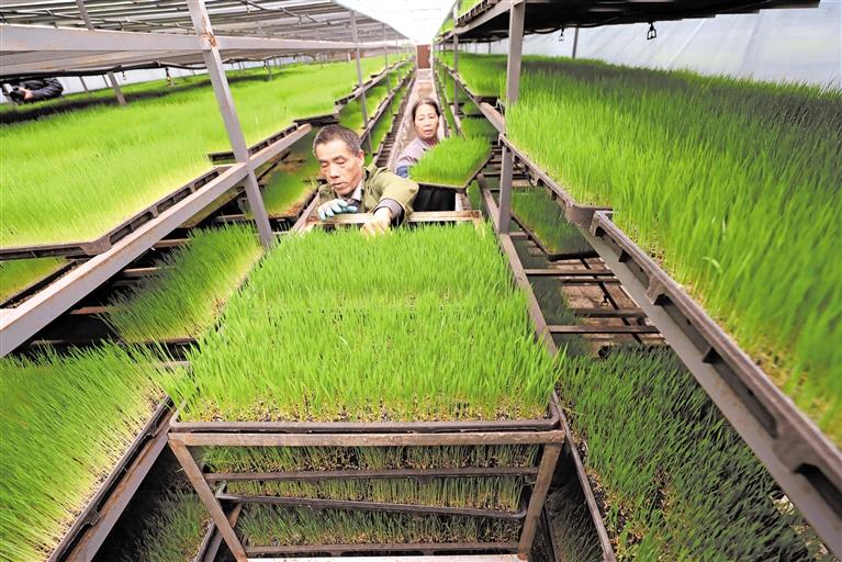 剑河县设立集中育秧基地,推动水稻育秧专业化、集中化、规模化。图为工人在该县展架村的育苗基地搬运水稻秧苗。 杨家孟 摄(贵州图片库发)
