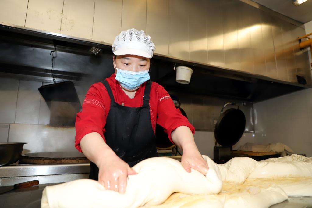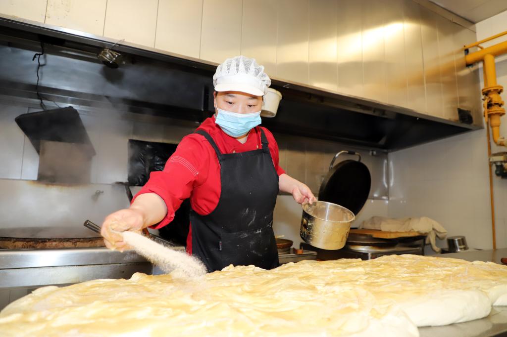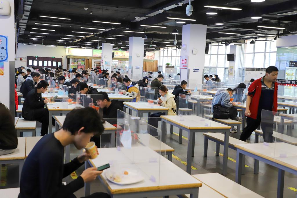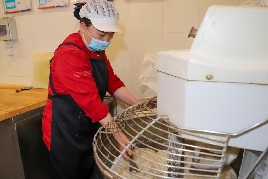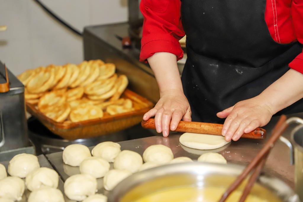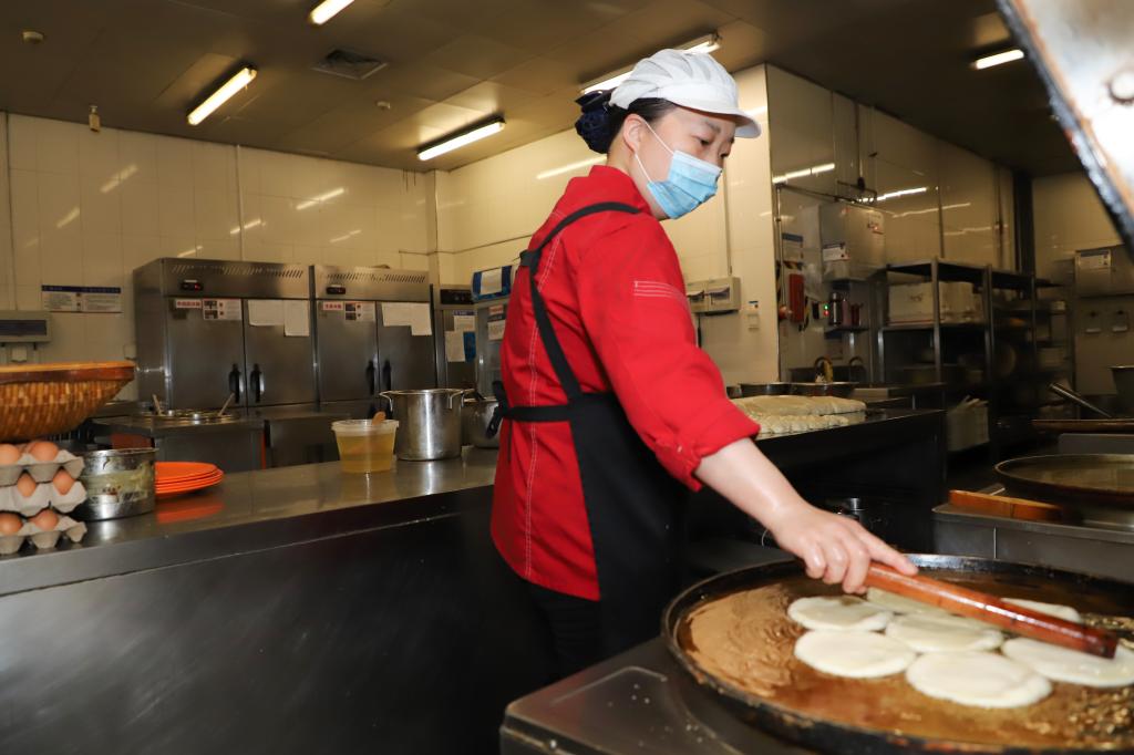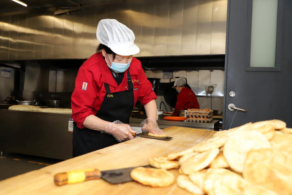 揉面、抹油、擀制、下锅……周晓霞娴熟的将一个个面团,变成各式各样的早餐面点。“一般早上至少要做六七种面点主食,可以给同学们不同的选择。”一锅19个烧饼,周晓霞师傅要赶在一个小时内至少做出8锅,以便给负责制作煎鸡蛋等其他餐品的师傅留出足够的电饼铛使用时间。搅拌、摊鸡蛋、食堂师傅们在自己的舞台上展现着自己的手艺。因疫情学校进入封校管理期间,为防范校外疫情传入风险,包括食堂、超市、快递等校内服务人员按照要求从3月12日起就开始住校服务,很多食堂师傅克服住宿困难,便住在食堂内。