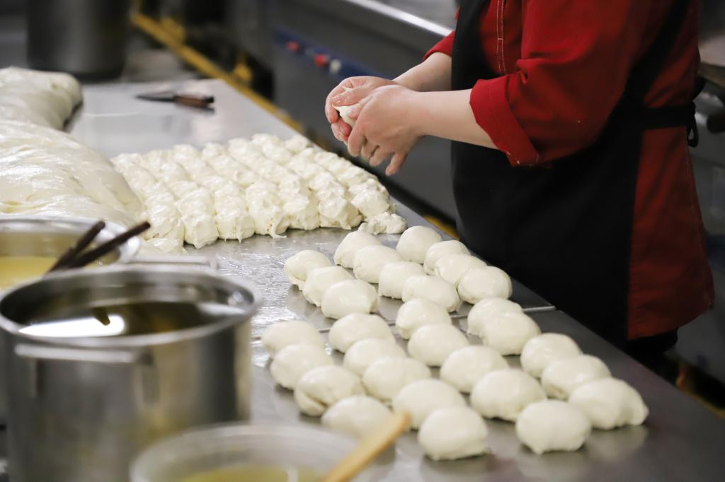 寻着光,梅园食堂档口后已经有了一个忙碌的身影,主食组周晓霞师傅已经在后厨开始了一天的工作,“我每天早上差不多三点多起床,四点就要开始和面进行备餐了”。将两袋共50公斤的面倒入搅面机,加入足量的饮用水,这是周晓霞每天制作早餐的第一步。北洋园校区梅园食堂,每天除承担日常师生早餐的供应外,疫情封闭期间还要与其他几个食堂共同负责为进行核酸检测的医护人员和在隔离宿舍隔离的师生供餐。“如果早上有核酸大筛,我们都要提前准备,凌晨2点半就会过来准备,就是为了能让医护人员和早起做核酸的同学们能够及时地吃上热乎的早餐。”