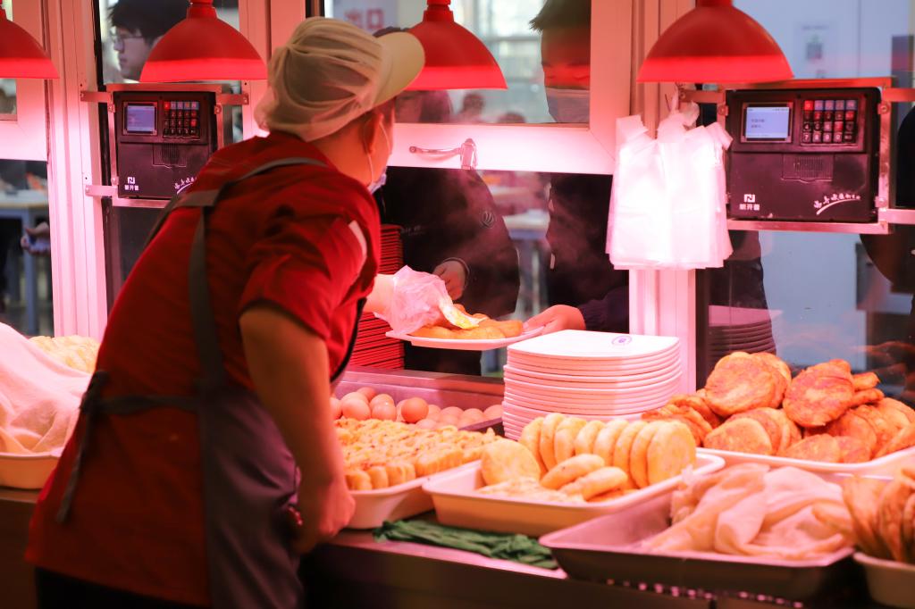 小米粥、小咸菜、包子、豆腐脑、油条、煎饼、烧饼、豆浆……同学们在窗口选择着自己喜欢的餐品,而在后厨,食堂的师傅们已经又在为午餐开始做着准备。