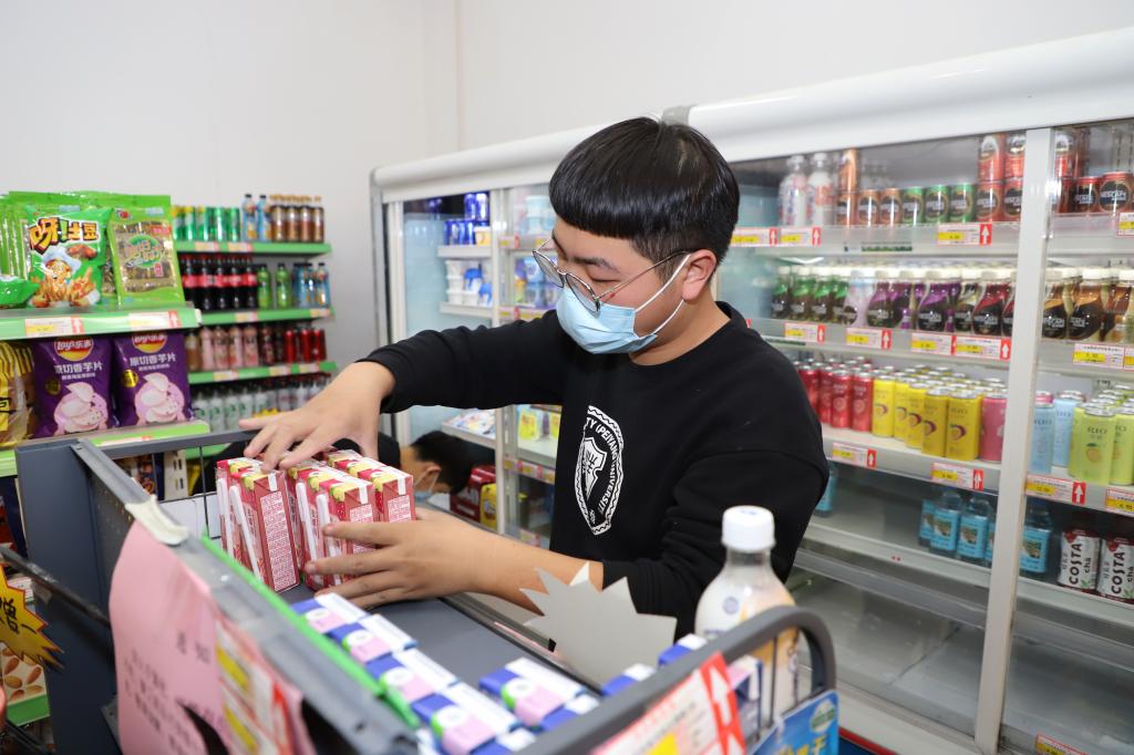 闭店后另外一项重要的工作就是对超市货架进行补货。校园超市按照要求,对每日送来的货物都要进行“先消毒再入店”。对于校外送货司机则按照要求施行“内外隔离”,入校对车辆贴封条,送货司机不准下车,严格避免与校内服务人员接触。货品从车上搬下来,再抬到二楼卖场的体力活,全部落到了店里的几位小伙子身上,“现在我们都把它当做是健身一样,经过这段时间的锻炼,完全没有刚开始那样吃力了”店里的几位店员笑着说。
