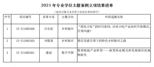 (记者 吴军辉)记者从研究生院专业学位办公室获悉,教育部学位与研究生教育发展中心日前下发了2021年专业学位主题案例立项结果通知,南开大学3项选题入选,其中“乡村振兴”主题2项、“数字经济”主题1项。