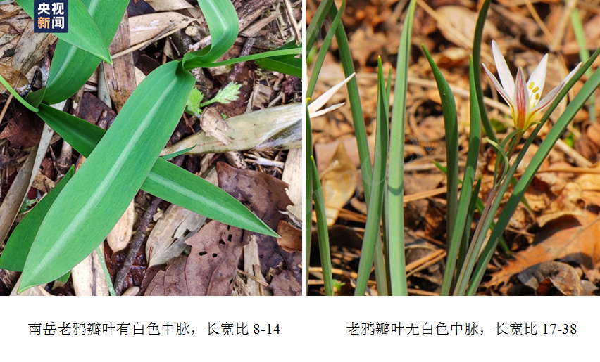 据了解,相对于老鸦瓣,南岳老鸦瓣叶较宽,瓣叶有白色中脉,而老鸦瓣通常没有;南岳老鸦瓣花药成熟时为紫色,而老鸦瓣花药成熟时为黄色。截至目前,南岳区境内的植物特有种一共有五种,除南岳老鸦瓣之外,还包括绒毛皂荚、窄花柳叶箬、毛柄金腰、南岳蹄盖蕨。