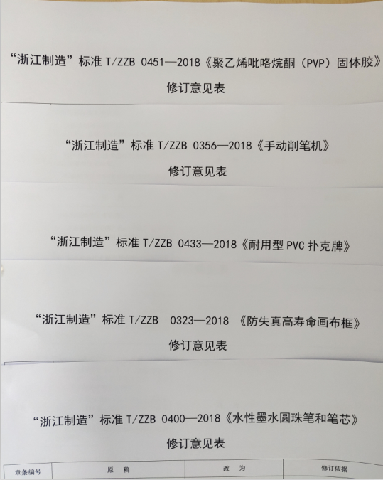 近日,协会理事长单位宁波康大美术画材集团股份有限公司的《防失真高寿命画布框》、名誉理事长单位贝发集团股份有限公司的《水性墨水圆珠笔和笔芯》、副理事长单位得力集团有限公司的《聚乙烯吡咯烷酮(PVP)固体胶》和《手动削笔机》和副理事长单位宁波三A集团有限公司的《耐用型PVC扑克牌》等5项“浙江制造”标准进行复审修订。