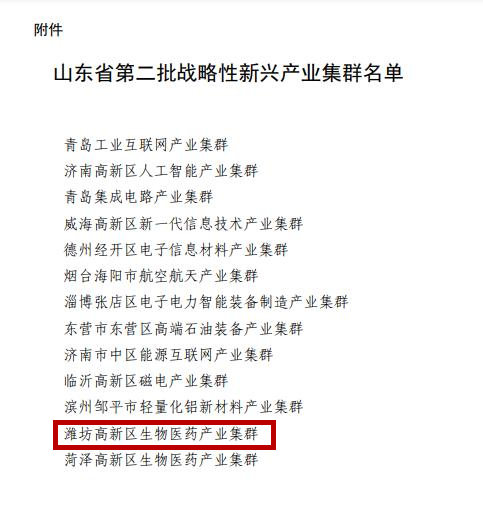 近日,山东省发展和改革委员会公布山东省第二批战略性新兴产业集群名单,潍坊高新区生物医药产业集群等13个省级战略性新兴产业集群入选。