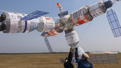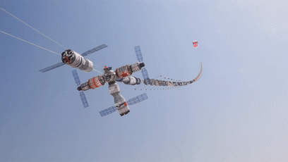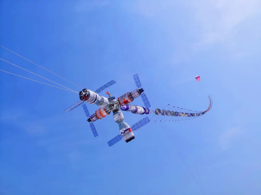 “中国空间站”主题风筝属于巨型技巧型风筝,主体是天宫号空间站,宽度3.5米、长度8米、高度3.5米,腰节长度150米,历经多次试飞改版。