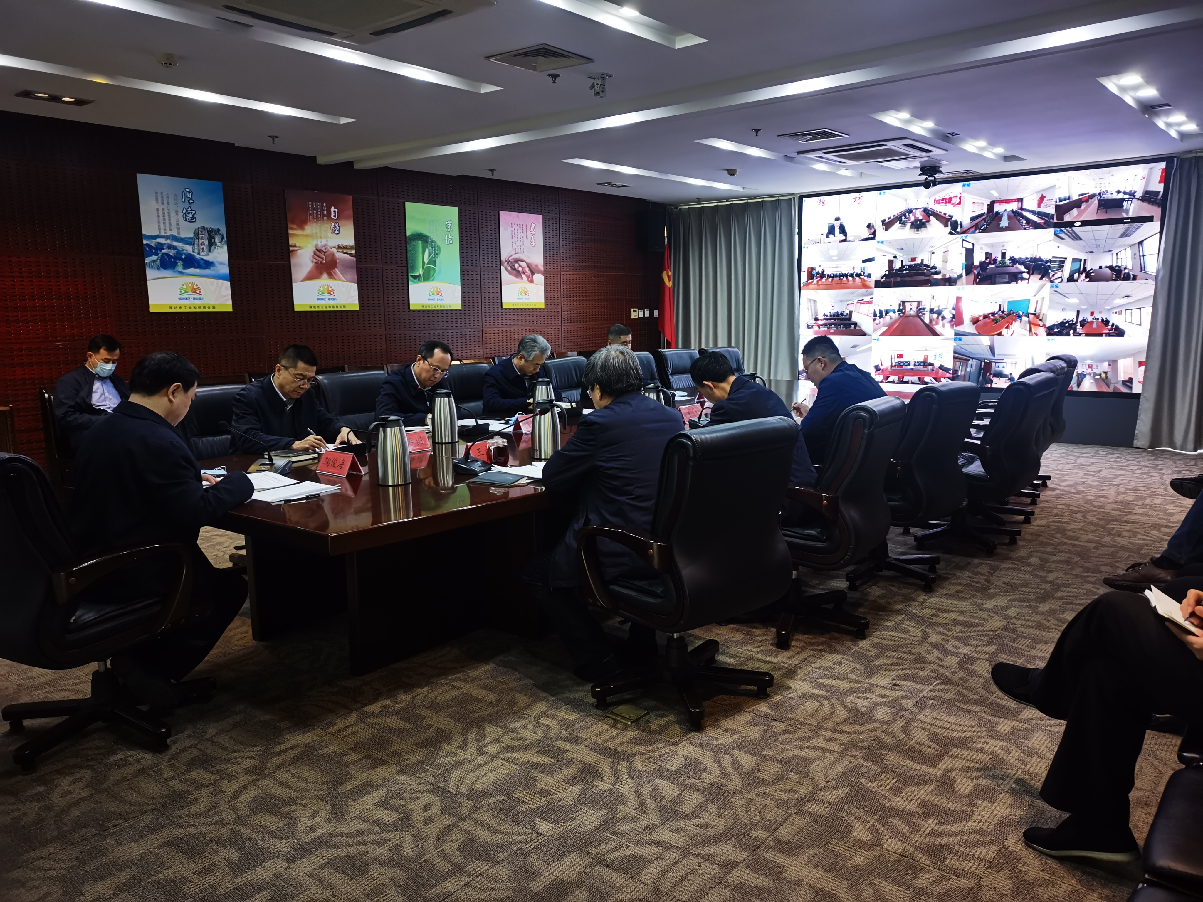 会议形采取视频式召开,主会场设在阳光大厦四楼中间会议室;各县市区工信局、市属各开发区经发局设分会场。会上王成喜、张振城、冷新法同志结合分管工作讲意见,鞠俊海同志做了重要讲话。