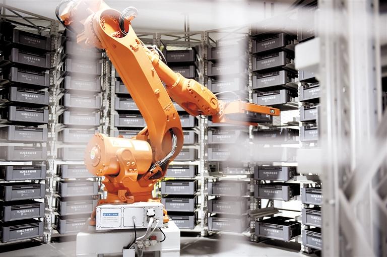 右图:智能机器人根据任务量自动匹配雨刮器的刮片和刮臂,按量送到打包台。