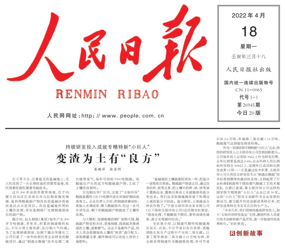 宁波涂协会员企业“钢渣法脱硫”技术荣登《人民日报》