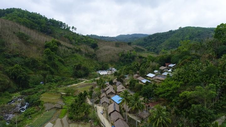 海南省五指山市初保村船型屋全貌(无人机照片)。新华每日电讯记者黎多江摄