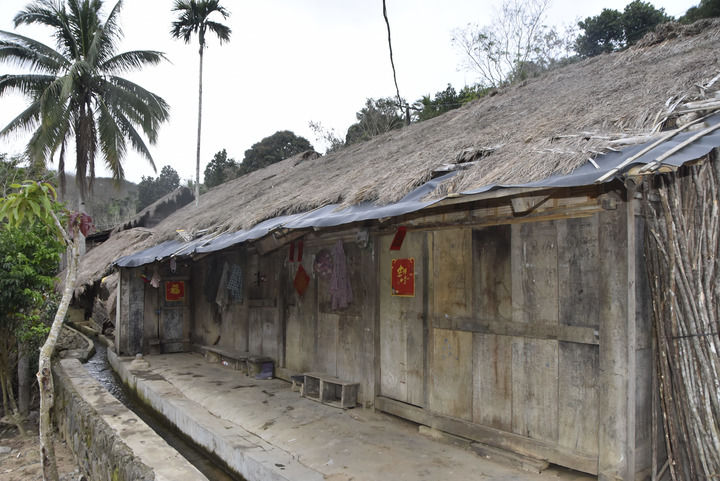 沿着村道往里走,左手边有几方绿油油的水田,山泉溪涧从村前流过。右边斜坡上,干栏式黎族民居风格的茅草房一间挨着一间,村落已无人常住,有些房顶的茅草已被更换为铁皮,有的房屋被用来饲养鸡鸭等家禽。从门外往里看,屋内低矮昏暗,泥土地、木板墙、三石灶……处处透着古老的气息。