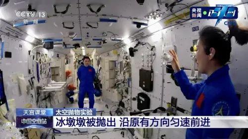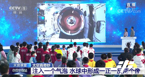 2022年3月23日,“天宫课堂”第二课开讲,“太空教师”翟志刚、王亚平、叶光富在中国空间站进行太空授课,演示了太空“冰雪”实验、液桥演示实验、水油分离实验、太空抛物实验等。