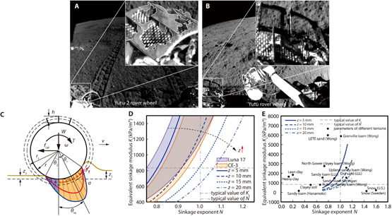 团队根据月球车车轮与月面作用的信息和地面力学模型估计了月壤的力学特性,结果表明月壤风化层的承压特性与地球上的干沙和沙壤土类似,与美国阿波罗计划中的典型月壤相比具有更强的承压特性。在多个不同地点的图像中观察到“玉兔二号”车轮粘附有大块团状土壤,而“玉兔号”的车轮基本不存在粘土现象,表明嫦娥四号着陆区附近月壤内聚力较大,其原因可能是包含较高比例的凝集物,使土壤颗粒经车轮碾压更易团聚。