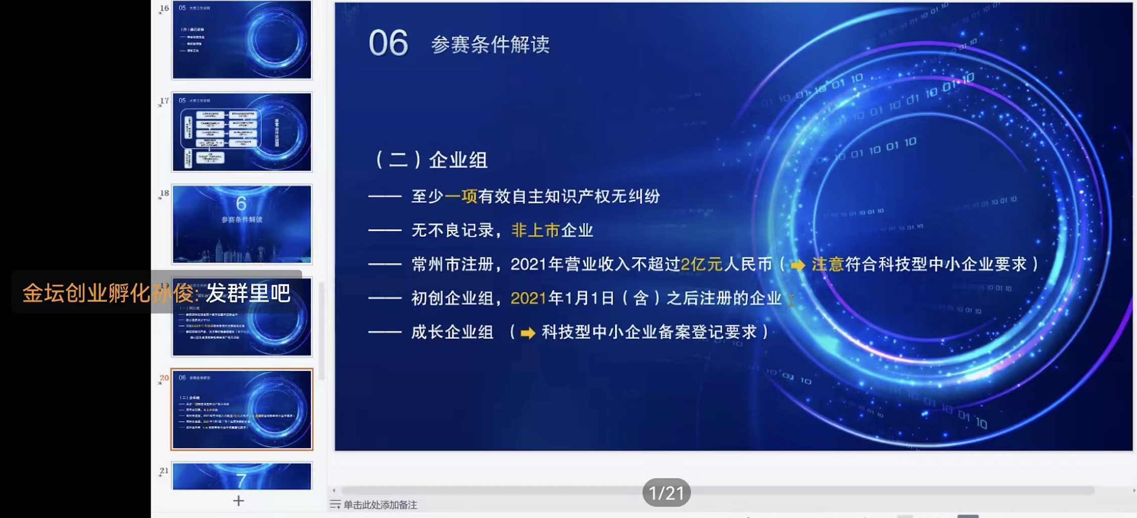 负责人表示,今年大赛的各项工作都遇到了不小的挑战,疫情防控要求高、工作难度增大,希望各部门积极做好宣传发动、项目征集、管理服务,把好审查关、推荐关,高质量地完成今年大赛组织工作。随后,常州市生产力发展中心负责大赛事务支持的工作人员介绍了大赛各阶段工作安排,并就今年大赛的工作方案进行了深入解读,重点对今年大赛赛制变化和主要支持政策要点作了详尽说明。