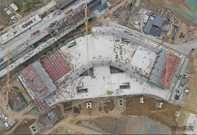 在不远处,南沿江城际铁路金坛站刚完成首片站台梁浇筑,进入施工新阶段,外立面雏形已显。