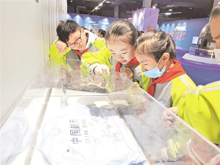 学生们对航天展品表现浓浓兴趣。