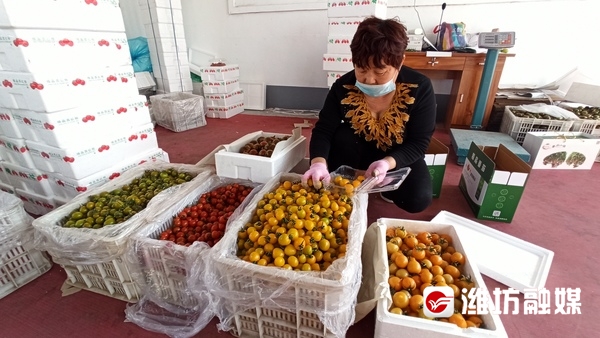 寿光前疃村,旺民蔬菜专业合作社联社工作人员把口感番茄装盒装箱准备发运