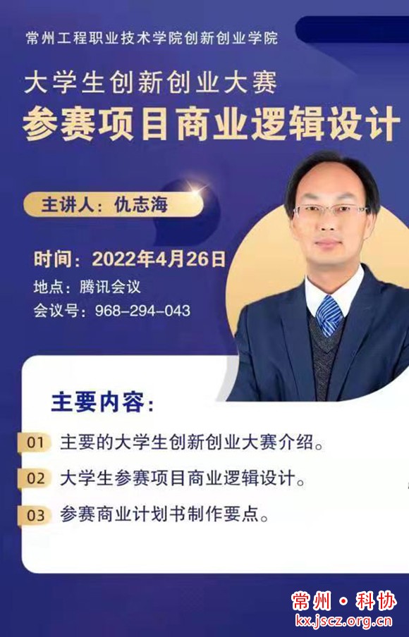 4月26日下午2:00,由市科协联合常州工程职业技术学院通过腾讯会议室共同举办线上第4期科技咖啡馆活动。邀请常州工程职业技术学院创新创业学院院长仇志海老师从大学生创新创业竞赛参赛项目商业逻辑设计入手,讲解如何制作参赛的商业计划书,为参赛选手排忧解难。