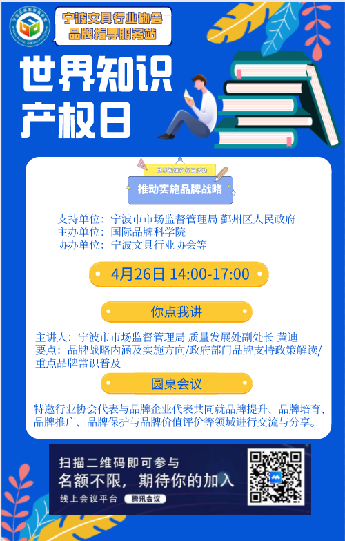 2022年4月26日是第22个“世界知识产权日”。为进一步贯彻落实知识产权强国战略,着力推动品牌建设,在市市场监督管理局支持下,宁波市文具行业协会(中小企业公共服务平台、文具行业窗口平台、品牌指导服务站)联合国际品牌科学院、宁波市汽车零部件产业协会、宁波市老字号企业协会通过线上与线下结合方式共同举办了“4.26知识产权日推动实施品牌战略公益活动”。