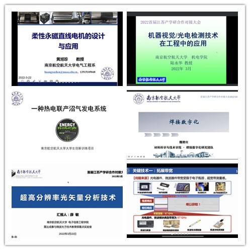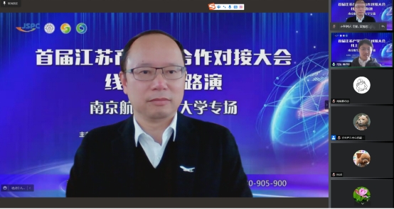 3月22日下午,首届江苏产学研合作对接大会线上项目路演(南京航空航天大学专场)活动顺利举办。本次专场活动由江苏省生产力促进中心、江苏省技术转移联盟、南京航空航天大学联合主办,面向智能制造、 电力电子、新材料等领域,开展产业化应用新技术、新成果的推介和对接。会议由我校科研院副院长、高新处处长沈建新和校科协秘书长冯绍红主持。