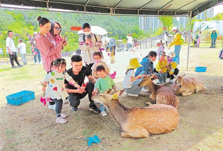 图为4月29日,游客在景区体验与梅花鹿“亲密接触”。